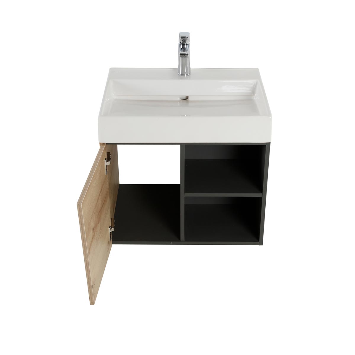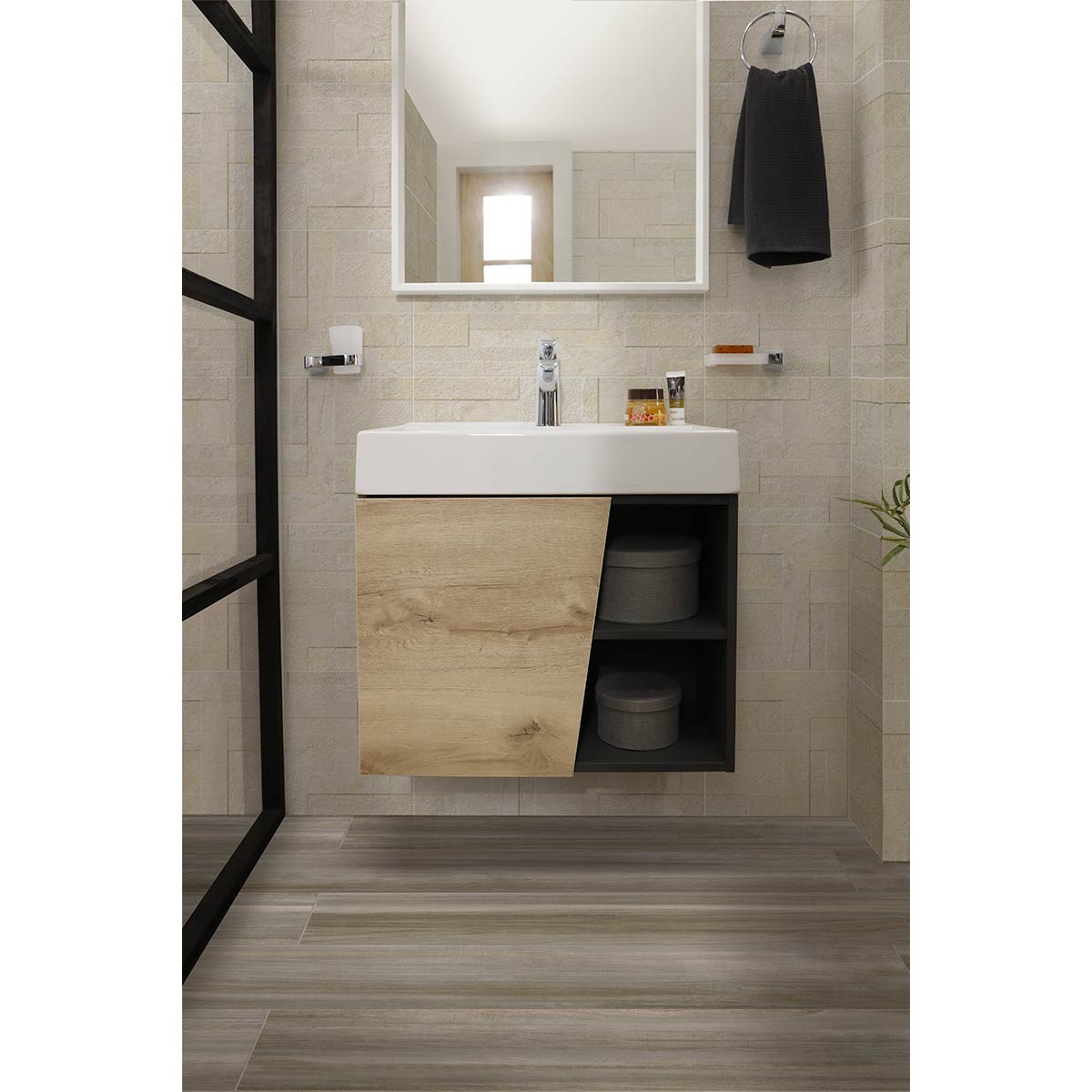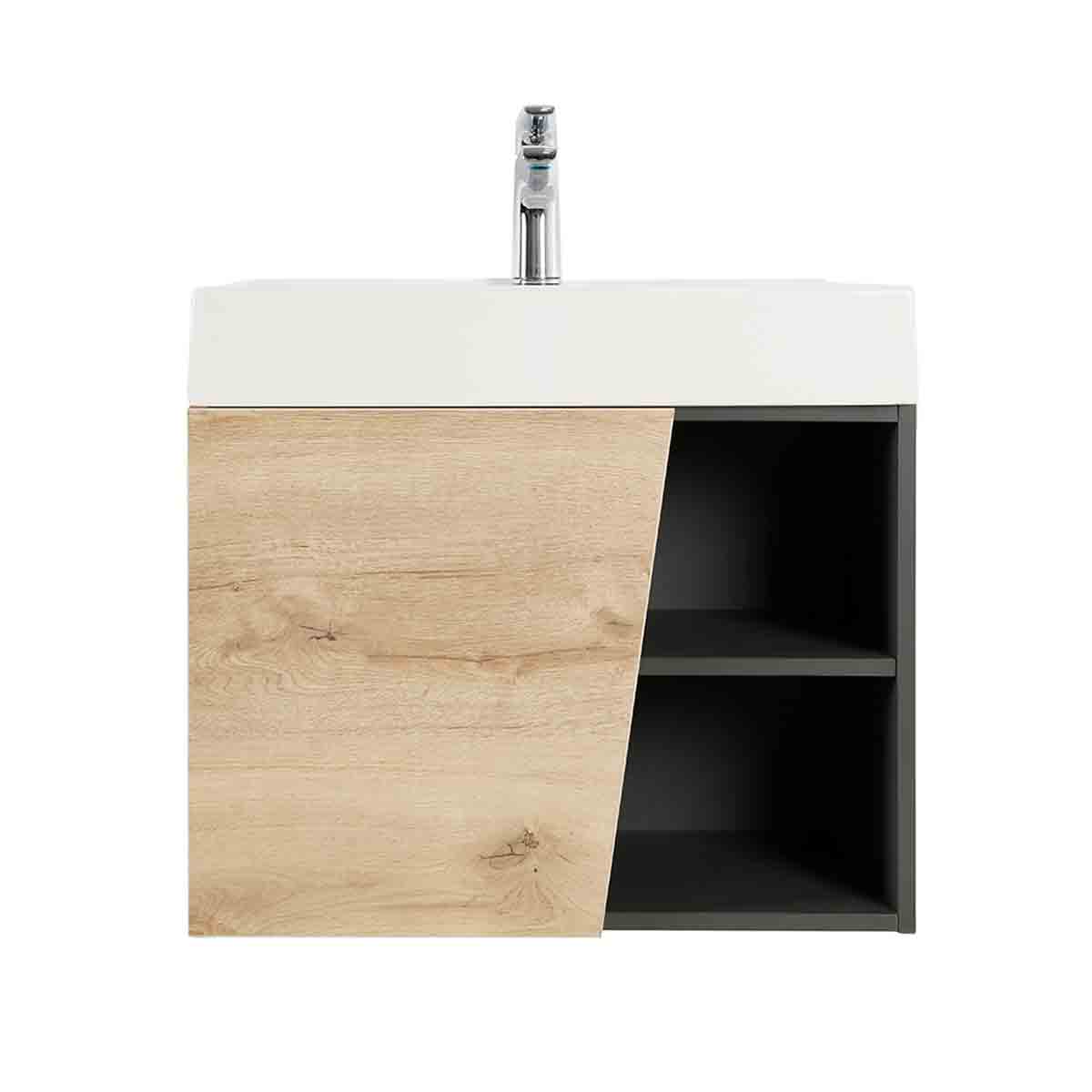 La línea de muebles Fussion Vital, dará a tu baño un estilo único y moderno gracias sus cortes diagonales que brindan diseño de vanguardia a tu baño y con una combinacion de color duna con plomo. Incluye repisa inferior expuesta e incrustaciones en aluminio con una puerta para una máxima capacidad de almacenamiento. Lo podrás encontrar en formato de 45,60 y 80cm con lavamanos 100% en porcelana con alta resistencia a rayones y no permite la acumulación de residuos, además, está elaborado en MDP con RH, mejorando su resistencia a agentes externos como la humedad y dando un acabado más robusto. Sus herrajes son de cierre suave que evitan golpes molestos.