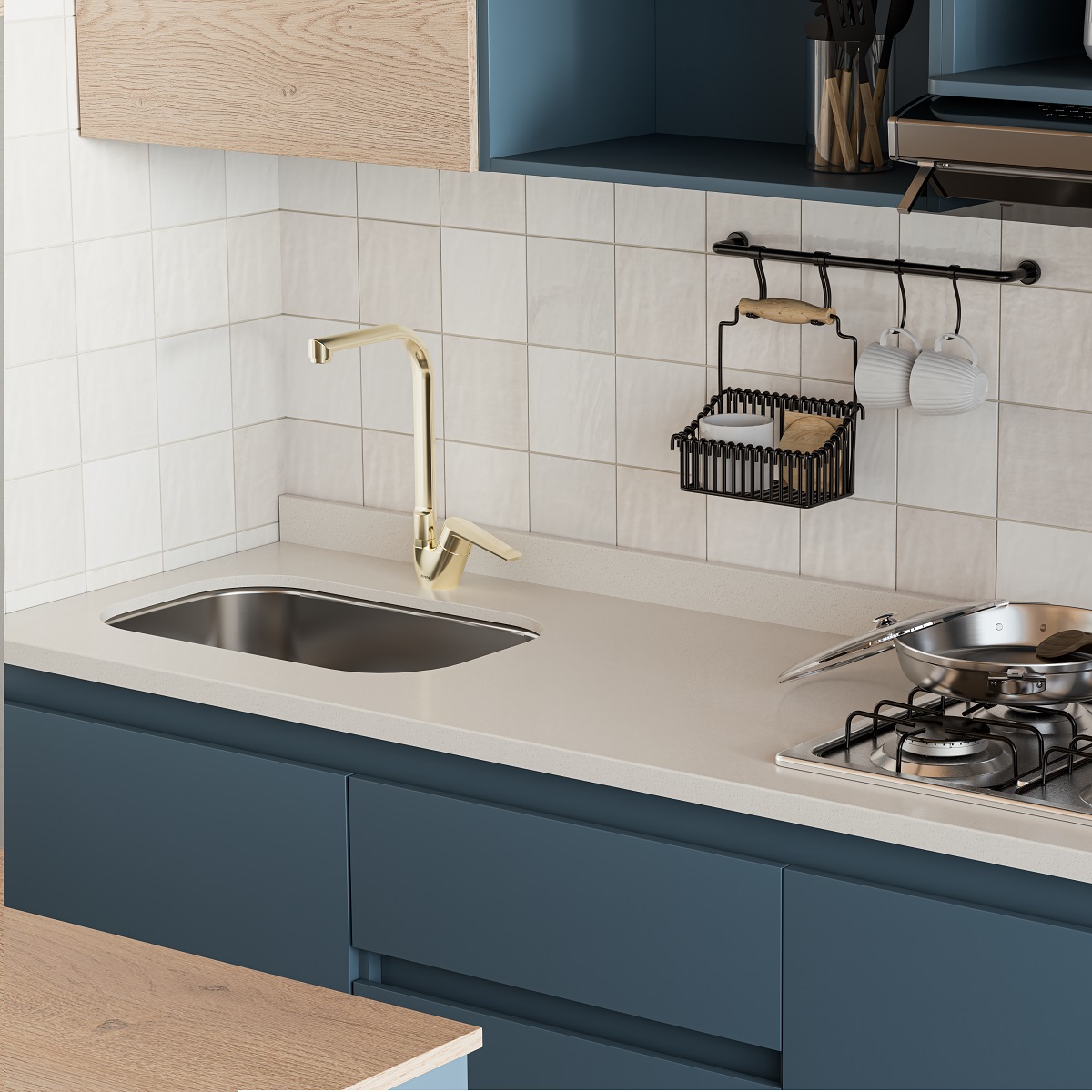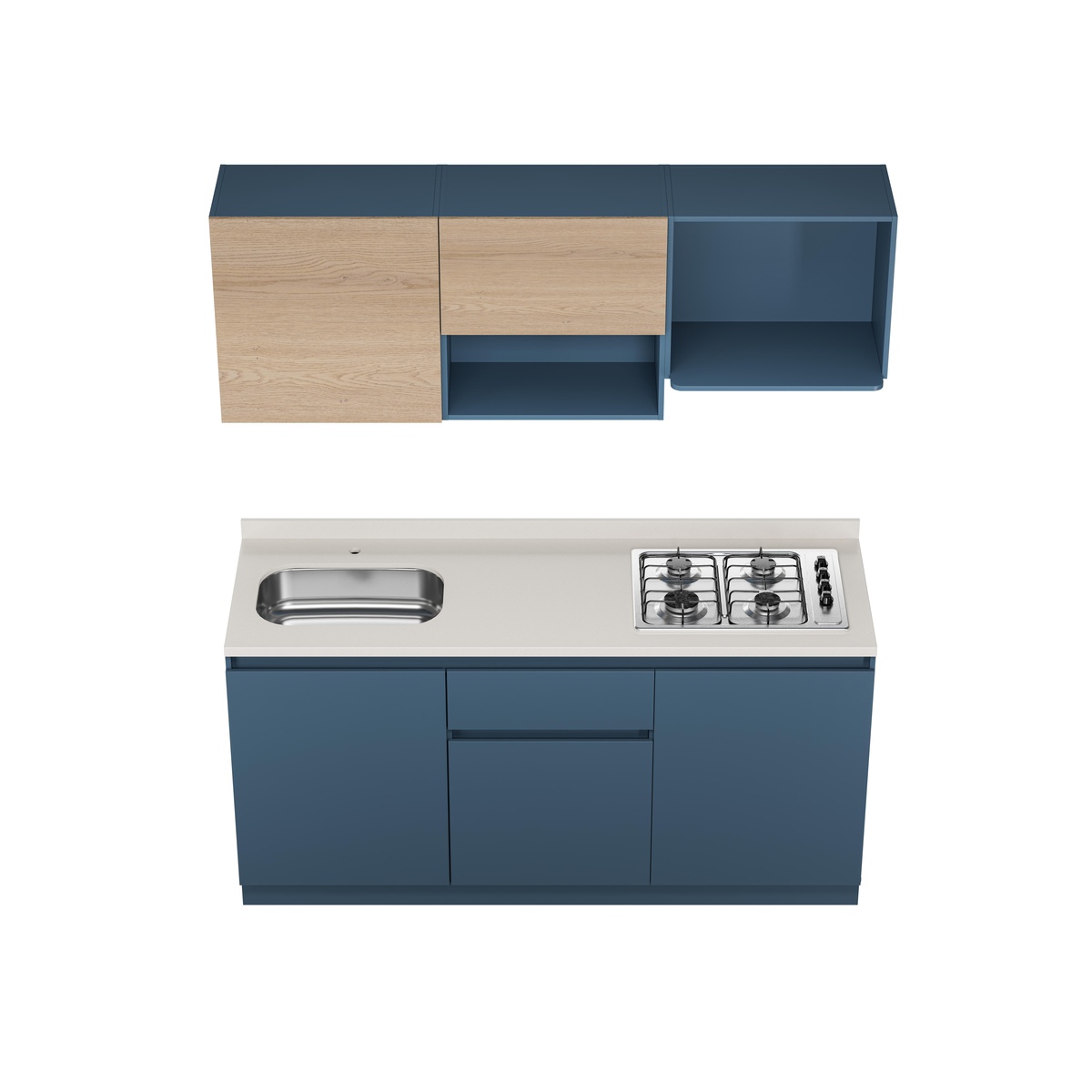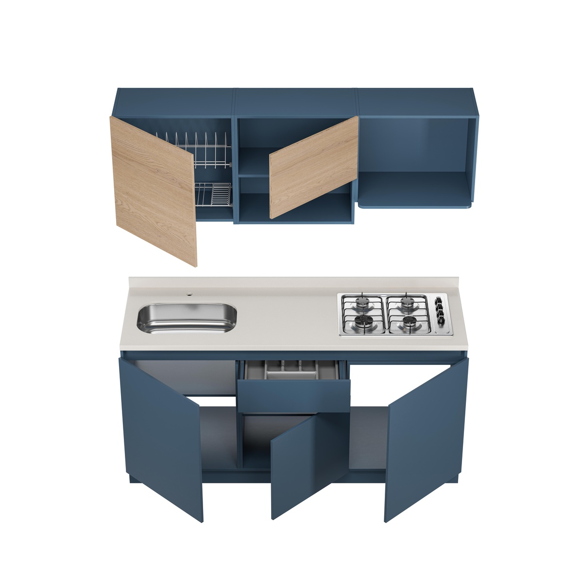 Descubre la Cocina Provenza Plus que combina a la perfección estilo y funcionalidad. Con un diseño contemporáneo en azul y madera clara, este conjunto incluye gabinetes superiores e inferiores, una encimera blanca con estufa a gas de cuatro quemadores y un fregadero integrado. Ideal para cualquier cocina moderna, este conjunto no solo optimiza el espacio, sino que también añade un toque de elegancia. ¡Renueva tu cocina y disfruta de un espacio único y funcional!
